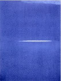 Ouverture de la nuit avec une lithographie de Geneviève Asse. Cette artiste originaire de Bretagne nous place dans un horizon d’attente silencieux où la nature se poétise en grandes abstractions épurées. « Je peins entre ciel et mer » dit-elle, entre ouverture et contemplation océanique, tout en architecturant la lumière. Dans ses œuvres l’objet s’est dissout au fil du temps tandis que le bleu devenait la couleur dominante, le matériau de base. « Le bleu est venu me chercher, puis s’est graduellement répandu. D’abord, ce furent des bleus de toutes sortes, ensuite un bleu différencié qui m’appartient vraiment, je crois. Petit à petit, j’ai trouvé mon bleu […] Je ne fais qu’un avec cette couleur. C’est un sentiment de profondeur et d’espérance réunie. Il est les deux. Et ce n’est pas seulement une couleur ou un sentiment. C’est un langage. » Un rai de lumière, comme celui filtrant à travers un volet, ouvre parfois ses toiles et devient un interstice d’air frais, une respiration.