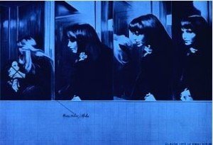En revanche, l’évanescence n’est pas de mise chez Jacques Monory. Dans la sérigraphie présentée, le moment est précis, séquencé, quadrillé, comme pour mieux saisir la fugacité de l’instant. Le titre redouble l’aspect factuel : Claude 1972 le 9 mai 21h05 (1972). La dramaturgie et le mystère de la scène s’intensifie avec le voile bleu qui la recouvre, l’asphyxie, la fige. Qui est Marie-Hélène/Micha ? Qui est Claude ? Peu importe. Dans les années 1960-1970, Monory a participé aux interrogations critiques de la Figuration narrative qui jugeait le piège séducteur des images et a emprunté au cinéma son langage. Il applique ici, sur son plan-séquence, un monochrome bleu impersonnel et bavard recouvrant sans distinction le dessin. Ce bleu a la valeur du blanc d’un film en noir et blanc, d’un film noir, froid et intense.