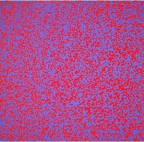 Trêve de « romantisme », le temps est aux mathématiques avec la sérigraphie carrée de François Morellet, Sans titre (1971), issue du portfolio 40 000 carrés. Dans cette mise en abime du carré, couleur et forme constituent un « plus petit dénominateur commun » unitaire et ce pixel, démultiplié, compose une image abstraite. L’artiste, co-fondateur dans les années 1960 du Groupe de Recherche d’Art Visuel, aime à jouer avec le hasard, la fragmentation, les interférences. Ici, il assemble bleu et rouge jusqu’à obtenir ce géométrique « fond neige télévisuel ». En s’amusant à pervertir la rigueur dans cette combinaison optique fantaisiste, il parvient à nous hypnotiser.