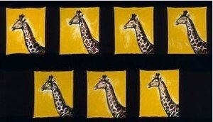 Avec la Girafe arquine (1990) de Carmelo Zagari, l’image réapparait, ensoleillée par la couleur jaune. Malgré les apparences, l’artiste met en place lui aussi une sorte de système avec ces girafes comme dupliquées et chacune inscrite dans un carré où la couleur domine. Or, cette fois, les carrés sont rares et imparfaits, le format est monumental, la toile est libre et la technique de l’acrylique offre originalité et nuance à chaque figure animale. Elles paraissent posées les unes après les autres dans un camaïeu serein d’ocre. En la qualifiant d’« arquine », il rappelle que cette série de girafes a été produite dans le village des Arques (Lot) mais surtout qu’il commence une histoire, un conte.