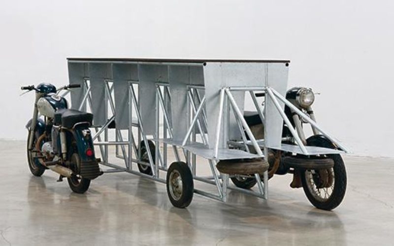 L'obsolescence et la technologie sont aussi parmi les sujets du dernier ensemble, soit deux œuvres offertes par Raymond Azibert aux Abattoirs, ici complétées par le prêt de deux œuvres de Bertrand Lavier – une composition géométrique dictée par un terrain de basket et une glissière d'autoroute devenue expressionniste. Le premier don, Sweet, light, crude est une œuvre monumentale de Jimmie Durham, variation chromatique et poétique sur le pétrole, énergie fossile au centre de tensions bien vivantes. Le deuxième, la Draisine de l'aérotrain de Raphaël Zarka est une sculpture témoignant de l'histoire d'une technologie de transport oubliée, une route vers le futur arrêtée dans le passé. "Voici voilà" nous dit aujourd'hui Raymond Azibert au sujet de son aventure.