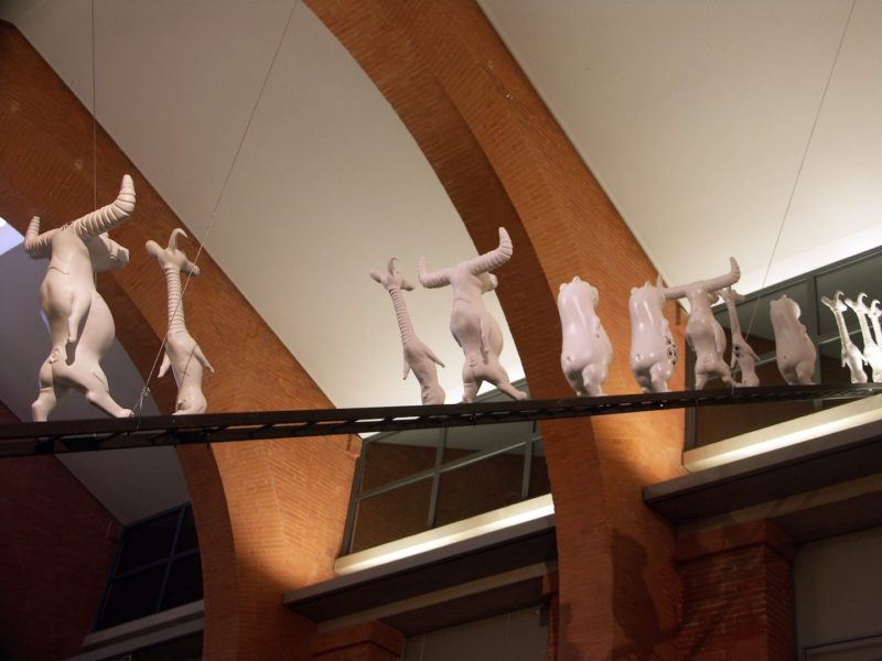 Liu Jia, "Le troisième œil". Etudiant en sculpture à l’Institut des beaux-arts du Sichuan à Chongqing, ce jeune artiste a conçu spécialement une œuvre pour la grande halle des Abattoirs avec un cortège de créatures fantastiques, hybrides d’humains et d’animaux, à partir de la légende du Erlangshen.