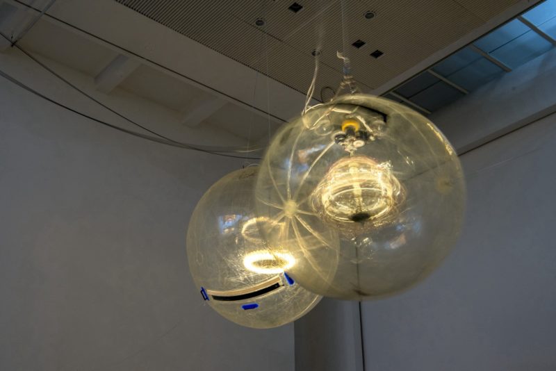 The installation Gonflables, contrepoids, transmission scooter électrique, lustres à pampilles, collecteur tournant, chaine de moto, vingt-quatre volts [Inflatable, counterweight, electric scooter transmission, crystal chandelier, rotating torque transducer, motorbike chain, twenty-four volts] takes the form of inflatable spheres of different dimensions. While the bubbles evoke a childhood game or the industrial productions of the 1960s, the crystal chandelier placed inside it, set off by an electric scooter motor, rotates indefinitely. Subverted from its function, the object produces a new energy, as well as original forms, sketched by the movement of the lights in the air. The sound created by the movement of the crystal beads is also amplified by that caused by their contact with the plastic sphere. Transformed by an overall movement, the parts of this old chandelier eventually cause one another to break. Endowed with a movement similar to breathing, the sculptures occasionally take on a frenetic pace. Creating systems with absurd and repetitive movements, the artist gives rise to an apparatus presenting organic characteristics. In a world in which machines are doomed to programmed obsolescence, the artist thus breathes new life into them. Laureate of the 2014 Révélations EMERIGE Prize, he lives and works in Brussels. The work of Vivien Roubaud has notably been exhibited at the Palais de Tokyo or, more recently, at the MAMAC de Nice. This is the first time his work has entered a French public collection.